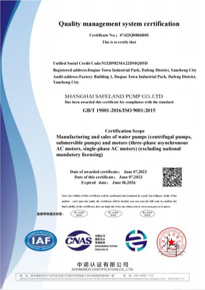 SAFELAND pumps has participated in the drafting of more than 20 national and industrial standards for water pumps, and obtained more than 100 patents. The series of products have obtained CE, SASO, ROHS and other certificates.